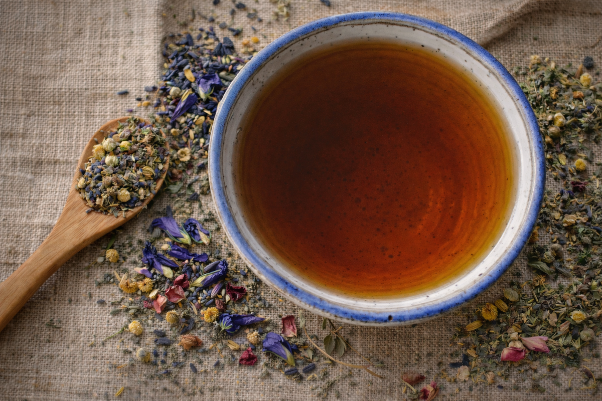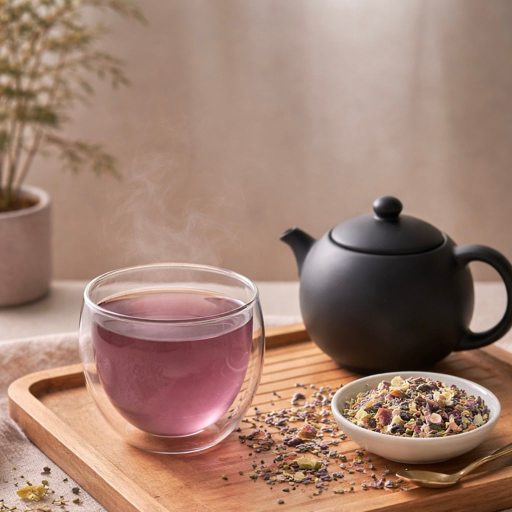 Key botanicals like chamomile and lavender invite relaxation, rose petals soften the heart, while lemon balm and holy basil help calm the mind and spirit. A touch of butterfly pea flower and hibiscus adds beauty and vibrancy to each steep, reflecting the harmony within.